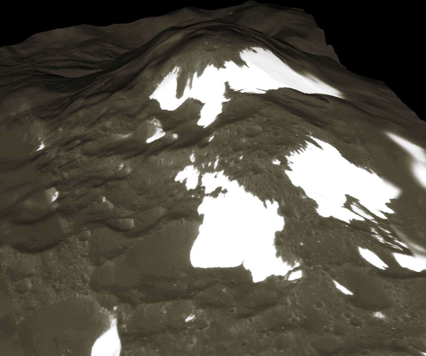 One of the many surprises of Saturn's icy moon Iapetus is the prominent topographic ridge that straddles the eauator like a walnut. The Cassini orbiter acquired a strip of color and stereo images along this ridge in September 2007, near the boundary between the dark and bright hemispheres. This stark albedo contrast has been observed since the late 1600's and was famously described in Arthur C. Clarke's novel adaptation of "2001: A Space Odyssey." The origin of the ridge is unknown but Cassini's stereo data indicate the ridge at this site is broken into several sharp peaks 15 to 20 kilometers above the surrounding dark cratered plains. These are among the highest peaks in the Solar System. This perspective view looks southeast toward one of these peaks and is based on stereo topography derived from Cassini orbiter imaging data. Patches of bright pure water ice can be seen flanking these dark peaks, which have the brightness of soot. The scene is ~70 kilometers across and is excerpted from a new movie showing a hypothetical flight over Iapetus. Mosaic base is at a resolution of 55 meters per pixel. Image processing, stereo topography, and visualization were performed by Dr. Paul Schenk, Lunar and Planetary Institute, Houston.