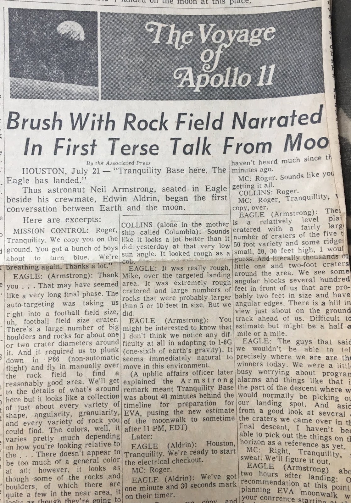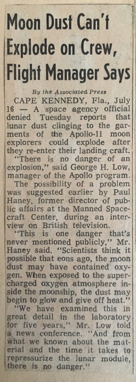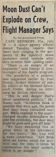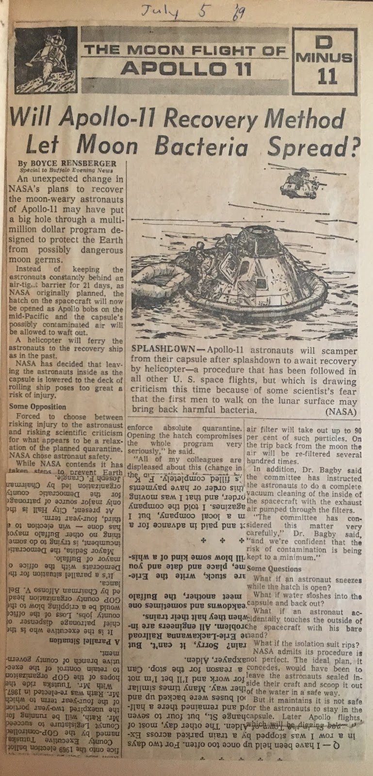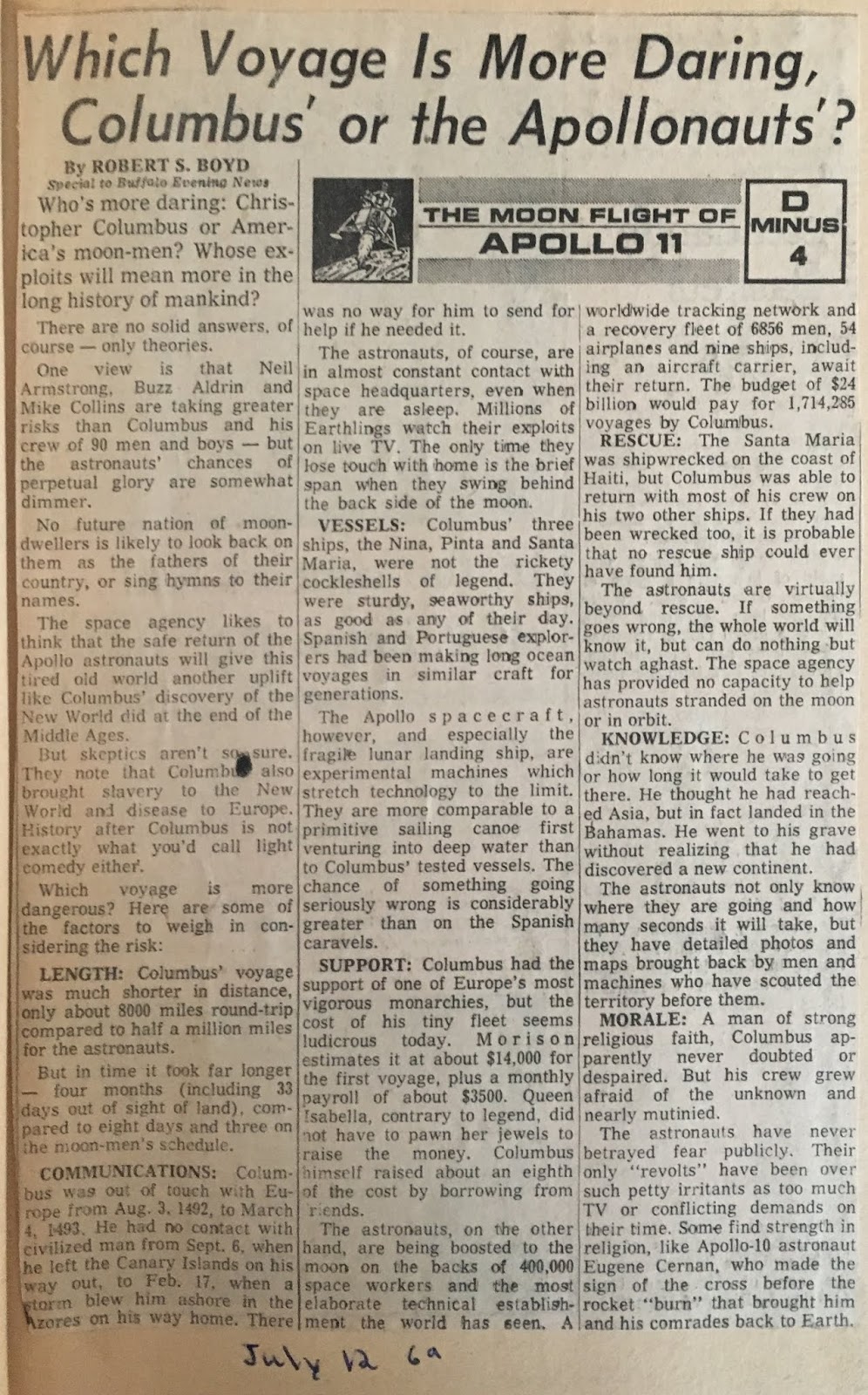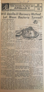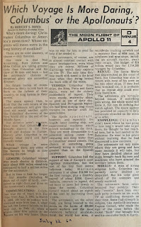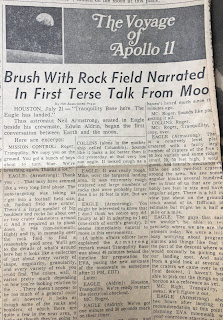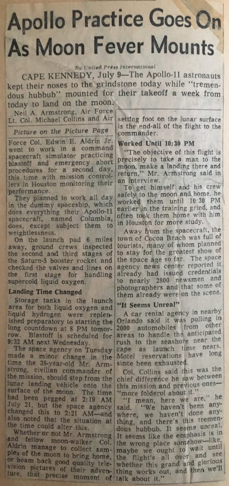 Every so often I remember the scrapbooks I filled with newspaper clipping from the Apollo missions, and the 50th anniversary of Apollo 11 is certainly one such occasion. I was a lad of 10 and deeply immersed in the wonders of space, starting with Gemini. The daily newspapers, weekly news magazines (Time, Newsweek) and the 3 main networks were the only source of news, photos, stories, but at least they were reliable, unbiased and reasonably thorough. Our newspapers were the Buffalo Evening News and the Courier-Express. I started scrapbooking with Apollo 1, skipped 7 & 8 (why I don't know) and started again with 11. The run-up to launch features 2 weeks of general articles looking at the more philosophical or unusual aspects of the mission. I won't comment much on them except to suggest watching out for a few of the more interesting headlines in light of how much our knowledge has increased since then and how the past 50 years have transpired. Enjoy!