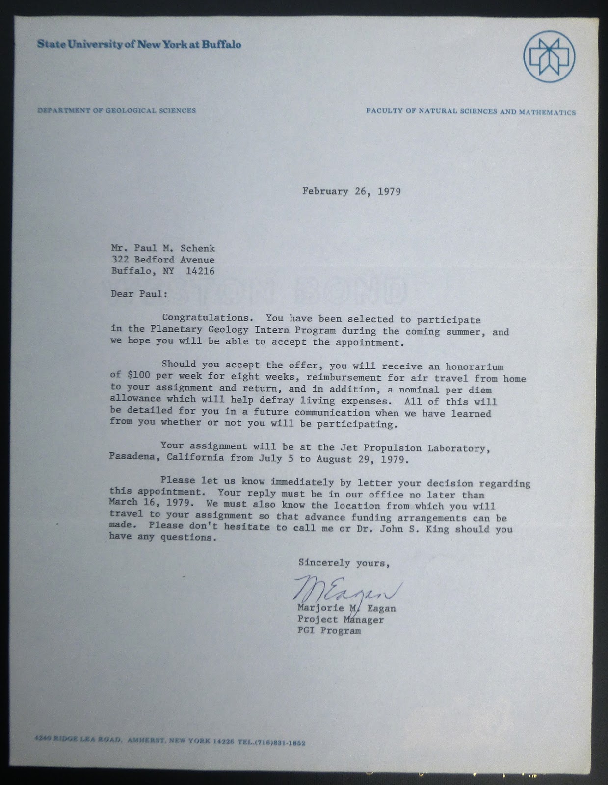 I was a bicentennial high school graduate but did not believe I could handle science. By late 1978, having flunked out of our Fine Arts program, I had discovered geology, and it was fascinating, soaking it up like a sponge. I was blessed by the guidance and mentorship of Dr. Carl Seyfert, author of the text book "Earth History and Plate Tectonics" and whose father discovered Seyfert galaxies. Carl had that ‘fire in the belly,’ that genuine enthusiasm for science, logic and curiosity that a young undergraduate was so easily infected with. In Autumn of 1978 a flyer was posted on the department bulletin board announcing a national Summer Intern Program in planetary sciences. It didn’t take a genius to figure who in the department was going to apply.