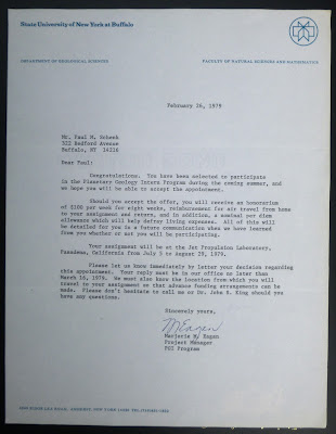 day except that it was so cool to be selected that I kept the letter and its envelope. I showed Carl and he was very pleased. I wanted to go immediately and was a little disappointed I could go to the first big Voyager event. Voyager 1 was barely a week out from Jupiter