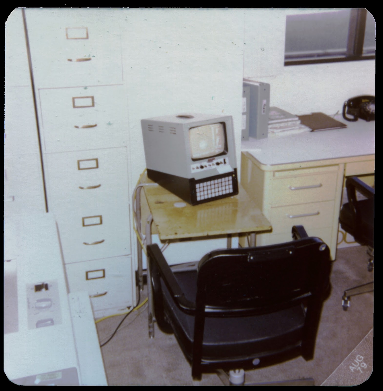 | My desk space, I think. Not sure why I would photograph it if it wasn't. The TV monitors were ubiquitous at JPL and allowed us to view all the Jupiter images as they came down. |